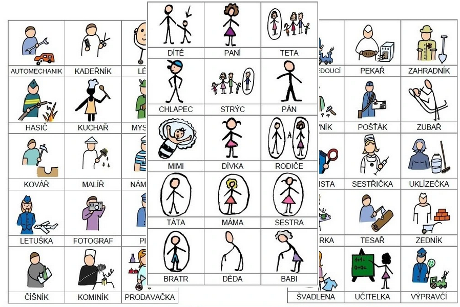 - Fotografie nebo piktogramy členů rodiny: maminka, tatínek, sourozenci, babička, dědeček, oblíbení lidé z okolí (např. paní učitelka, asistentka, terapeut).