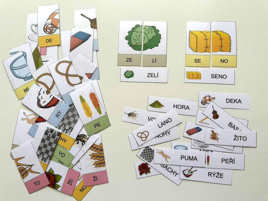 Sada obsahuje skládanky s obrázky slov na 2 slabiky. Děti si hravou formou procvičí čtení slabik a z nich složí za pomocí obrázků celá slova. Výuková pomůcka je určena začínajícím čtenářům předškolního věku, prvňáčkům a dětem se speciálními vzdělávacími potřebami. Sada obsahuje celkem 18 obrázků (celkem 72 dílů).