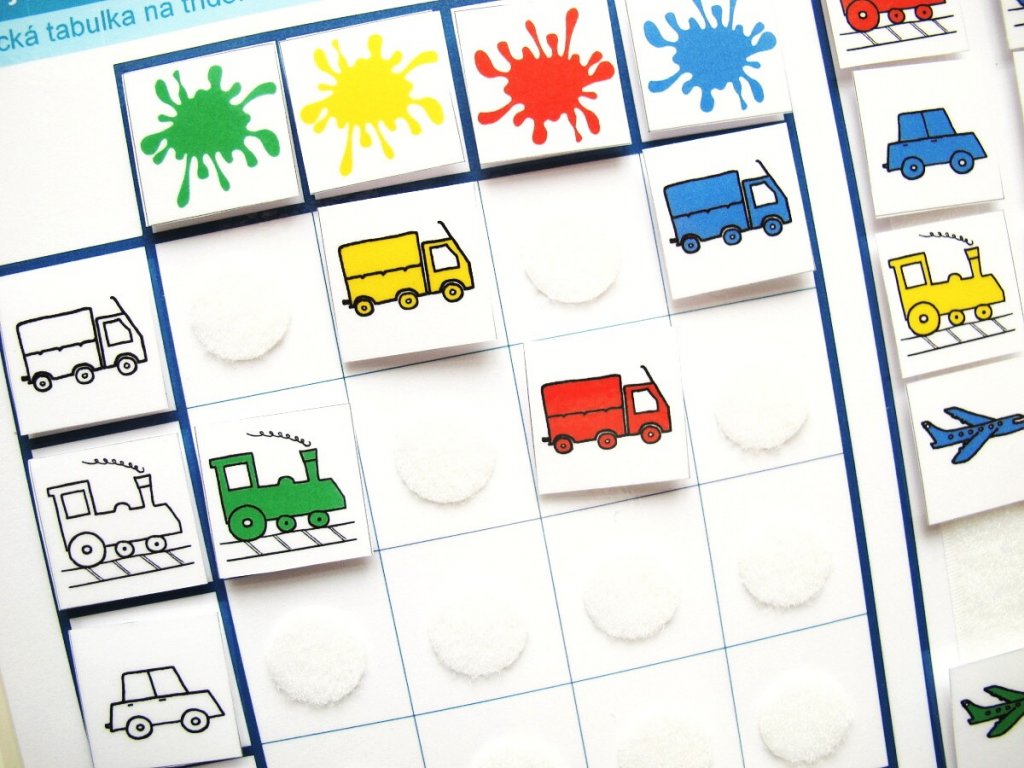 Čtyři strukturované tabulky zaměřena na třídění podle barev. Po pravé straně je prostor na odkládání kartiček. Úkolem dětí je doplnit kartičky do tabulky dle zadání. Zadání se může měnit a tím dětem znesnadnit případné zapamatování řešení.