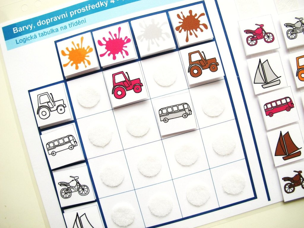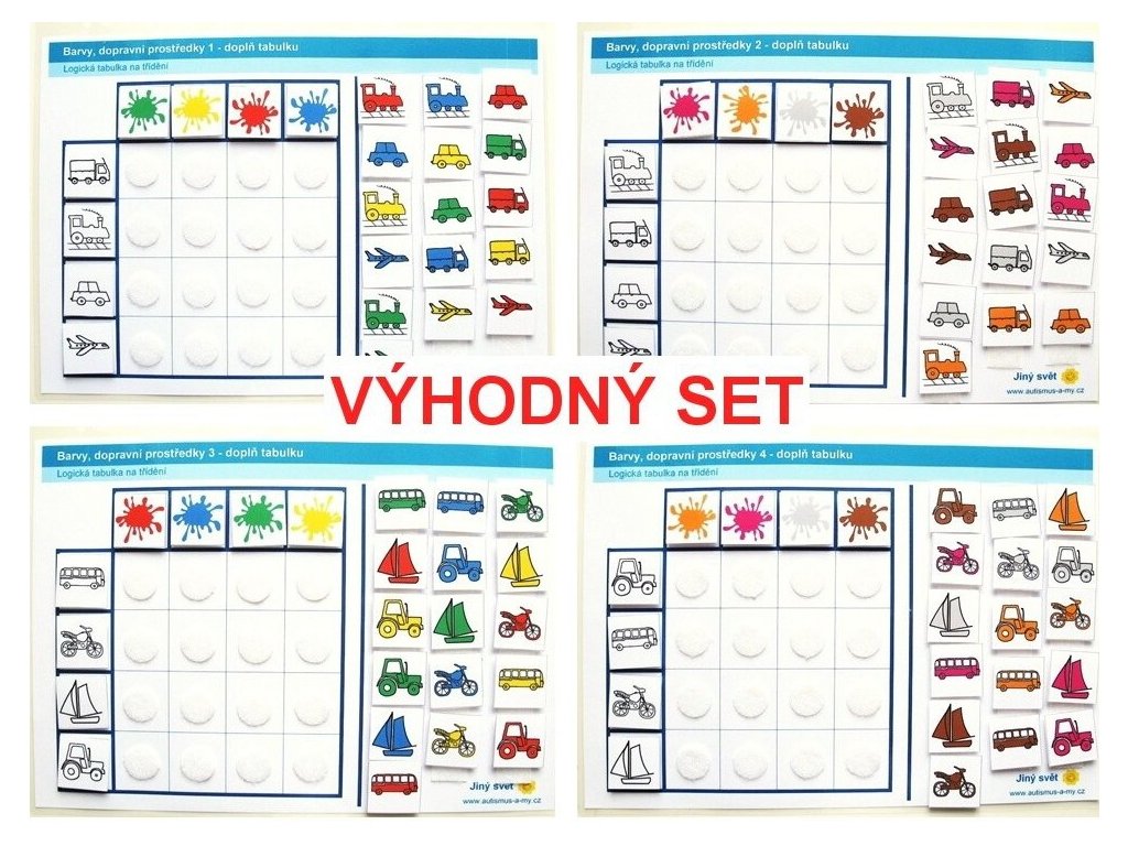 Jiný svět Barvy - dopravní prostředky VÝHODNÝ SET 1-4. Logická tabulka na třídění