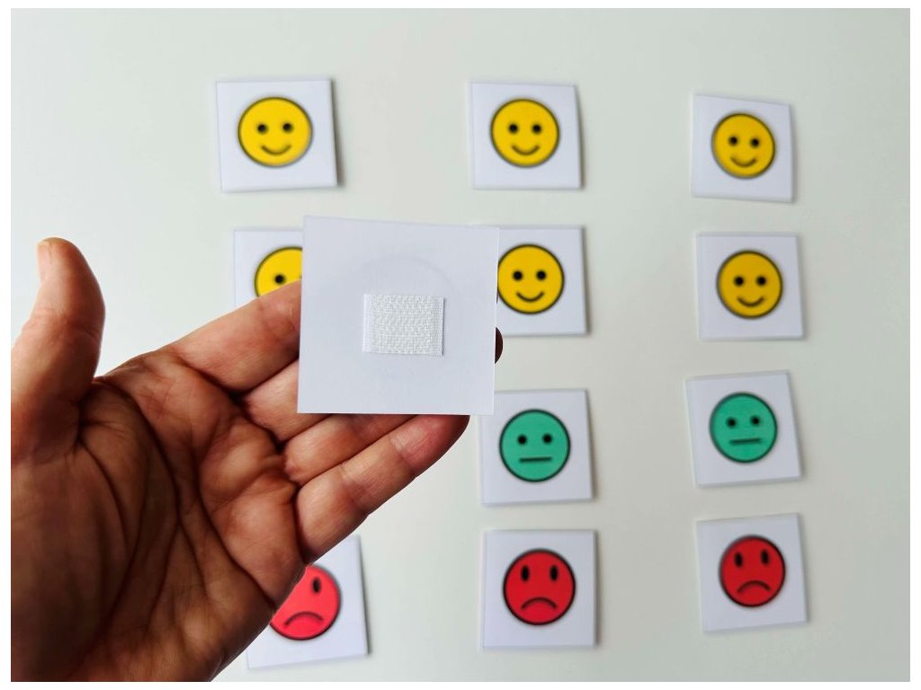 Laminovaná verze - 12 laminovaných kartiček se suchým samolepícím zipem (háček) na spodní straně, velikost cca 5x5 cm. V balení 6 ks žlutých, 3 ks zelených a 3 ks červených smajlíků.