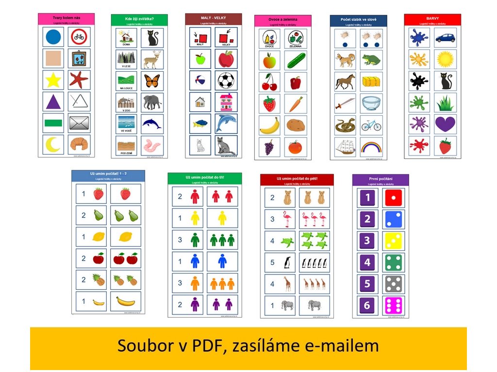 Jednoduché logické strukturované úkoly pro děti předškolního věku a také pro děti se speciálními vzdělávacími potřebami. Každý úkol je přehledný a jasně uspořádaný – ideální pro nejmenší děti i pro děti s autismem..