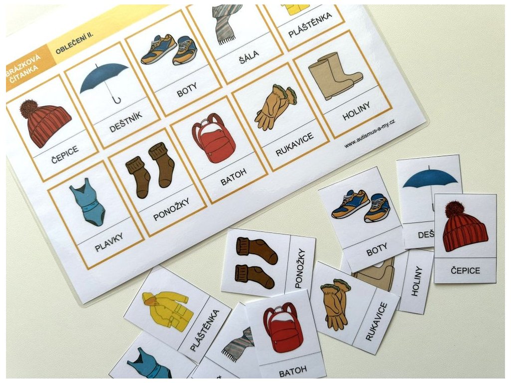 2. Jednotlivé kartičky děti pokládají na velkou kartu. Vezmou do ruky kartičku a na velké kartě hledají stejný obrázek s popiskem. V této fázi je důležitý hlavně obrázek.