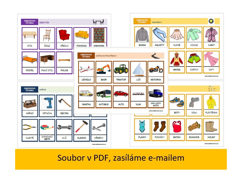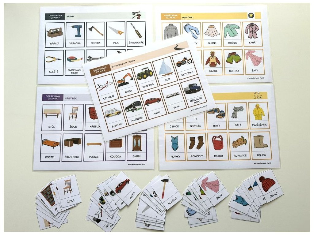 Balení obsahuje 5 úkolů, každý obsahuje 1 velkou kartu A4, 10 malých karet (10 obrázků, 10 popisků).