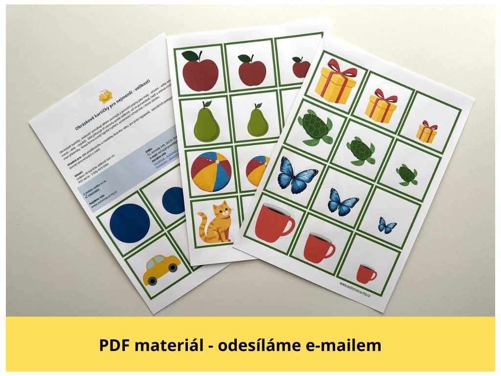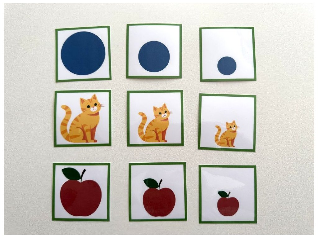 Obrázkové kartičky „Velikosti“ pomáhají dětem pochopit a procvičit pojmy jako malý - střední - velký nebo menší - větší - největší. Dítě přiřazuje tři obrázky podle velikosti, učí se porovnávat, řadit a vnímat rozdíly mezi předměty. Hravá forma rozvíjí logické myšlení, pozorovací schopnosti i slovní zásobu.