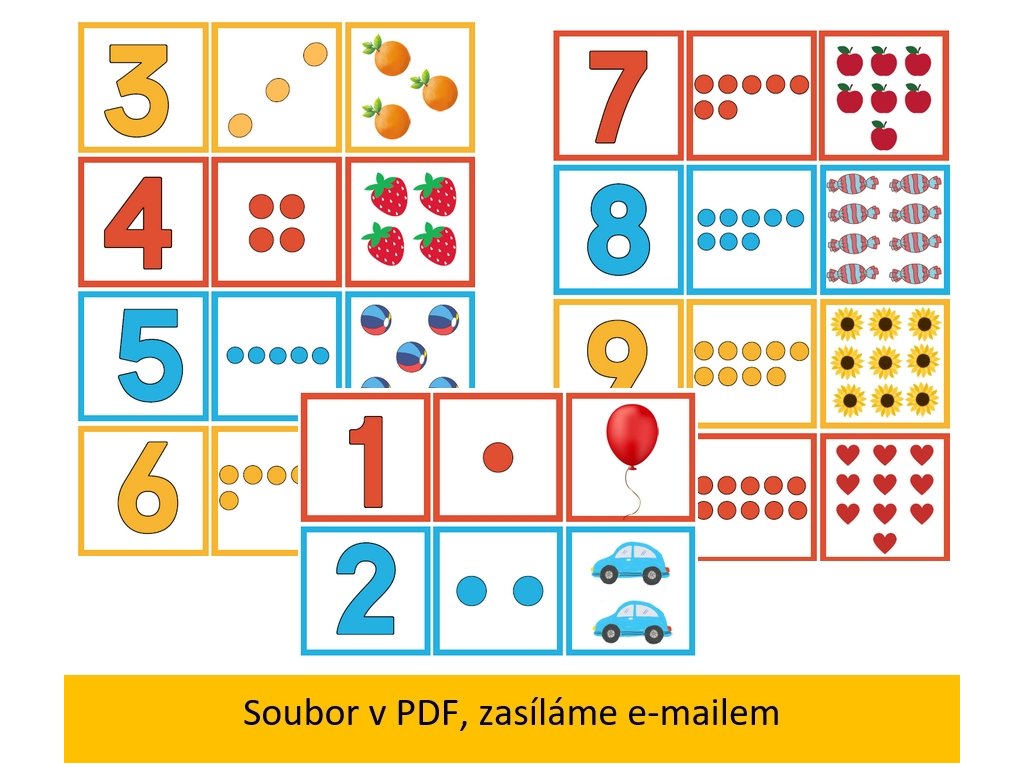 Vizuálně přehledné kartičky pro nácvik přiřazování čísla, množství a obrázku. Obsahují čísla 1–10 ve třech formách: číslice, tečky a obrázky předmětů. Jednoduché a efektivní aktivity využijete při domácím učení, ve školce i při terapeutické práci. Kartičky rozvíjejí základy matematiky, zrakové vnímání a logické myšlení.