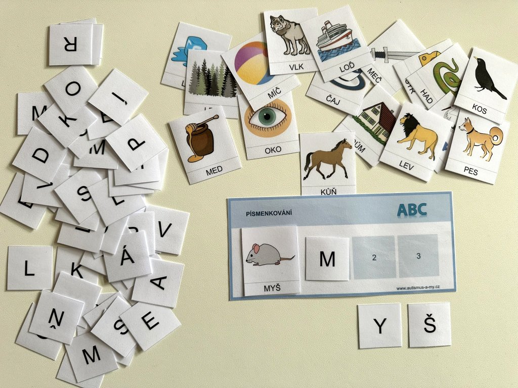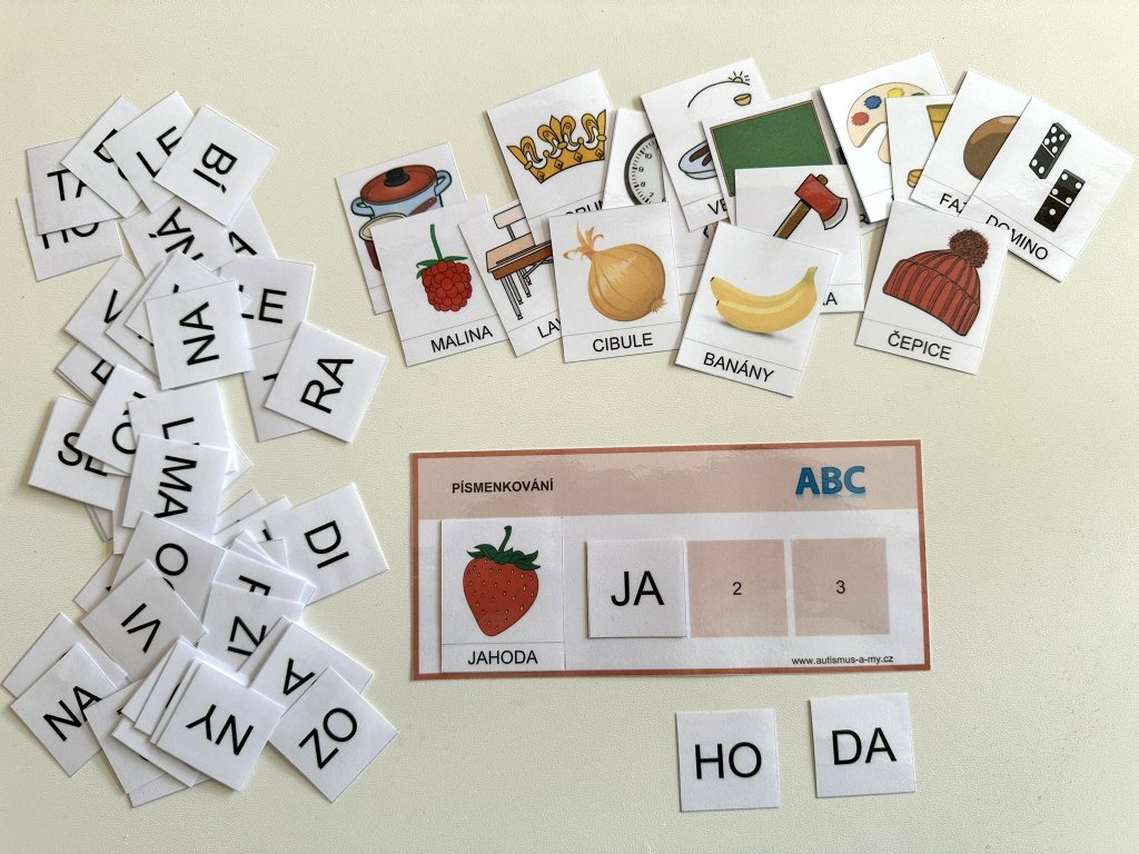 - Pod každým obrázkem je nápis. Ve chvíli, kdy dítě slovo skládá s jistotou podle vzoru můžeme nápis odstřihnout.