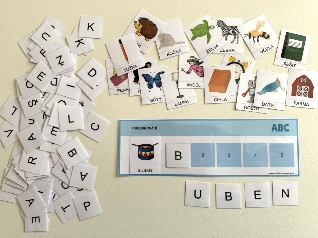 Písmenkování 3- skládání slov s vizuální podporou, 5 písmen