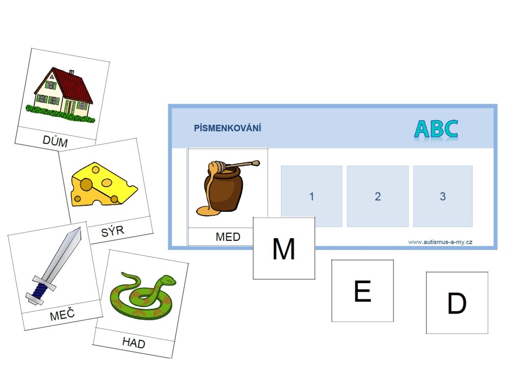 Písmenkování 1- skládání slov s vizuální podporou, 3 písmena