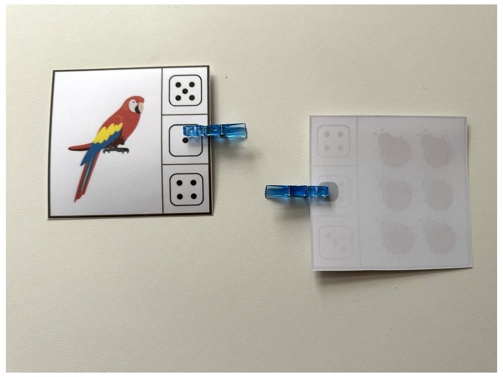 • Dítě vybere správnou odpověď a část karty s odpovědí stiskne mezi prsty, kartu otočí a zkontroluje si výsledek.