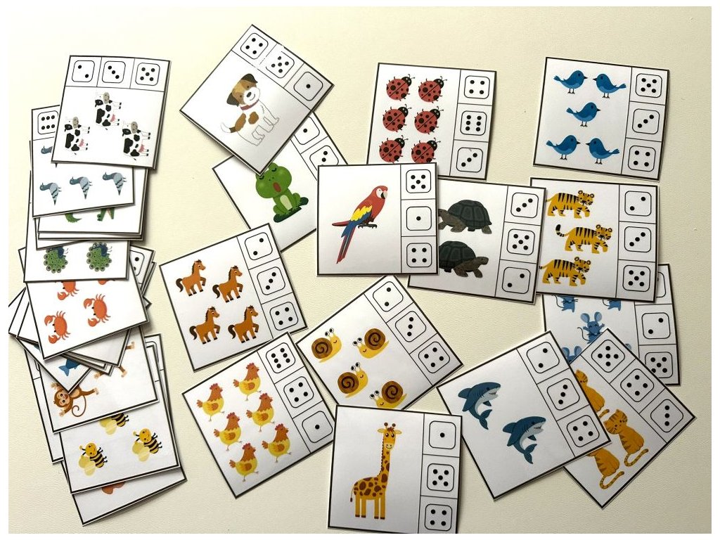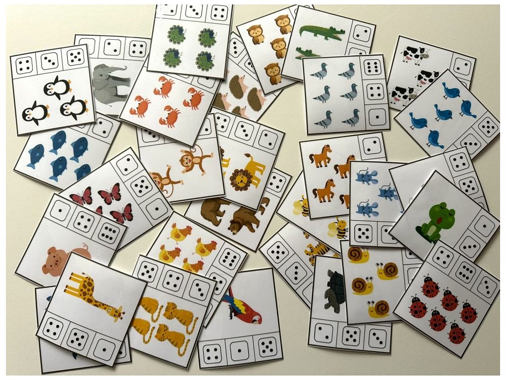 Didaktická aktivita pro děti, která podporuje počítání, zrakové vnímání a jemnou motoriku. Úkolem je přiřadit počet zvířátek k odpovídající kostce – dítě si tak zábavnou formou upevňuje: