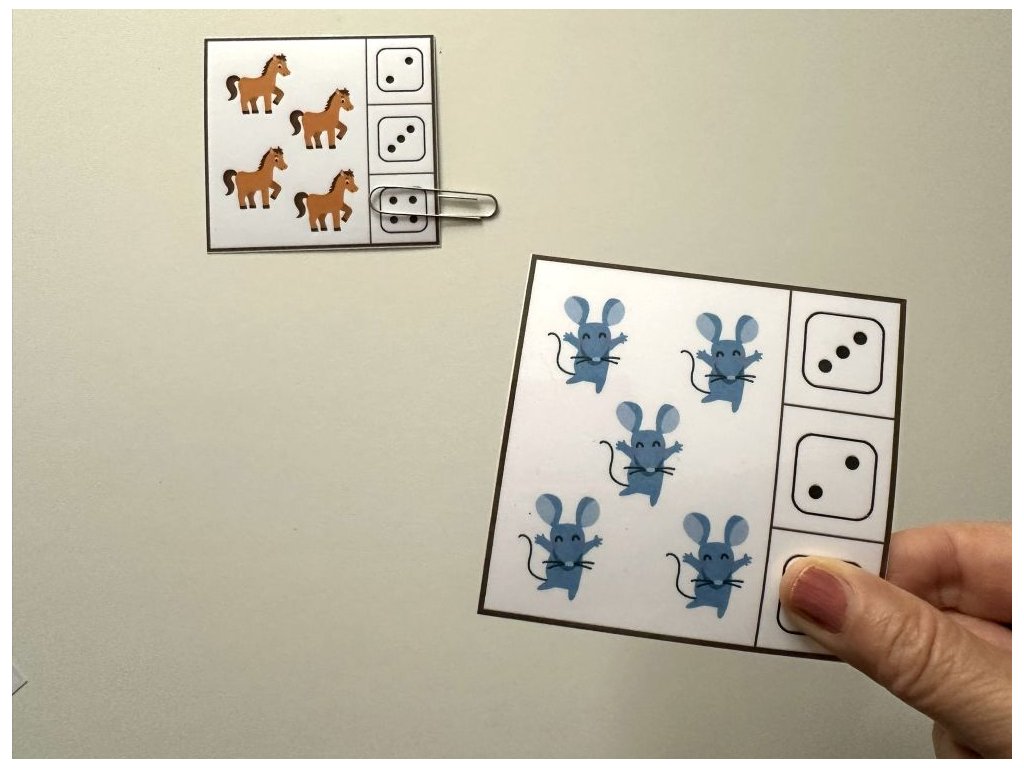- Dítě vybere správnou odpověď a část karty s odpovědí stiskne mezi prsty, kartu otočí a zkontroluje si výsledek.
